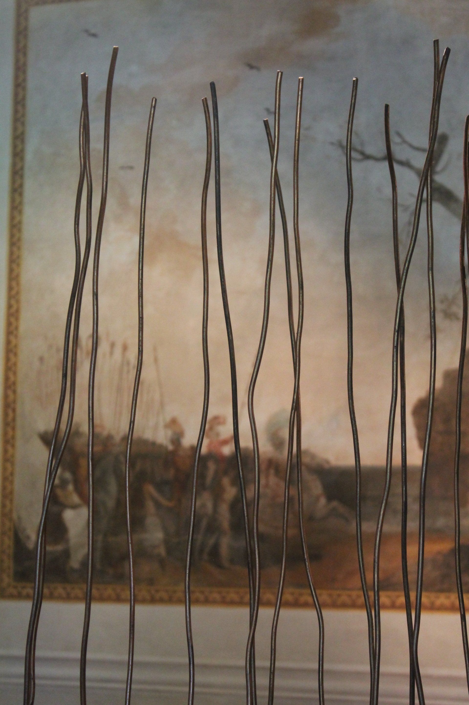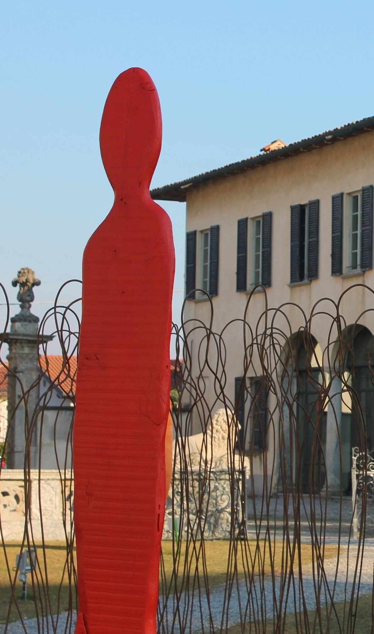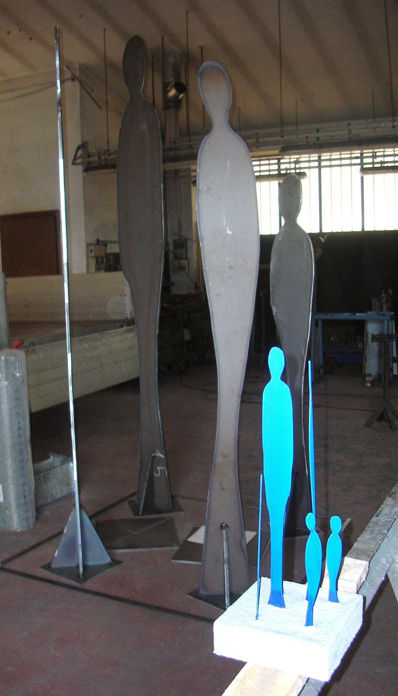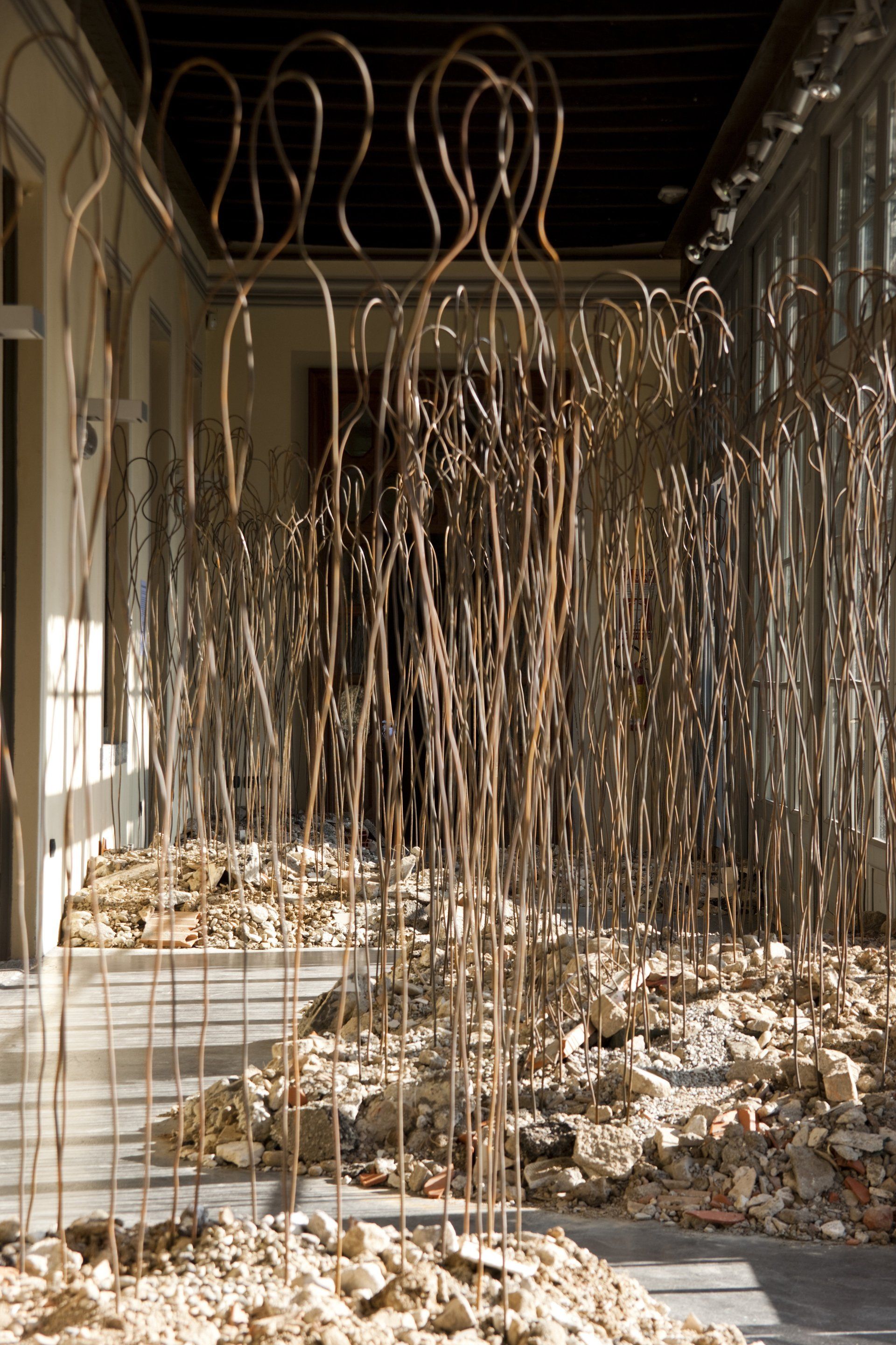 Seminare steli antropomorfi raccogliendo fiori di ferro. Una presenza di fili di ferro che non si defilano dalla vita, ma che si profilano eleganti ed essenziali nel paesaggio, istanze di rarefazione del segno: onde di ferro al calore bianco. Filiazioni di generazioni nell’età del ferro: un futuro arcaico che unisce mitologia titanica e pacata misura minimalista.