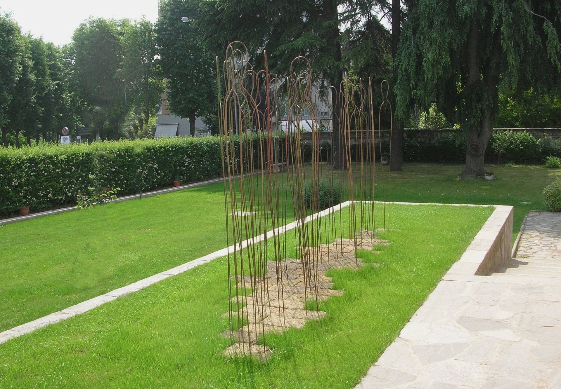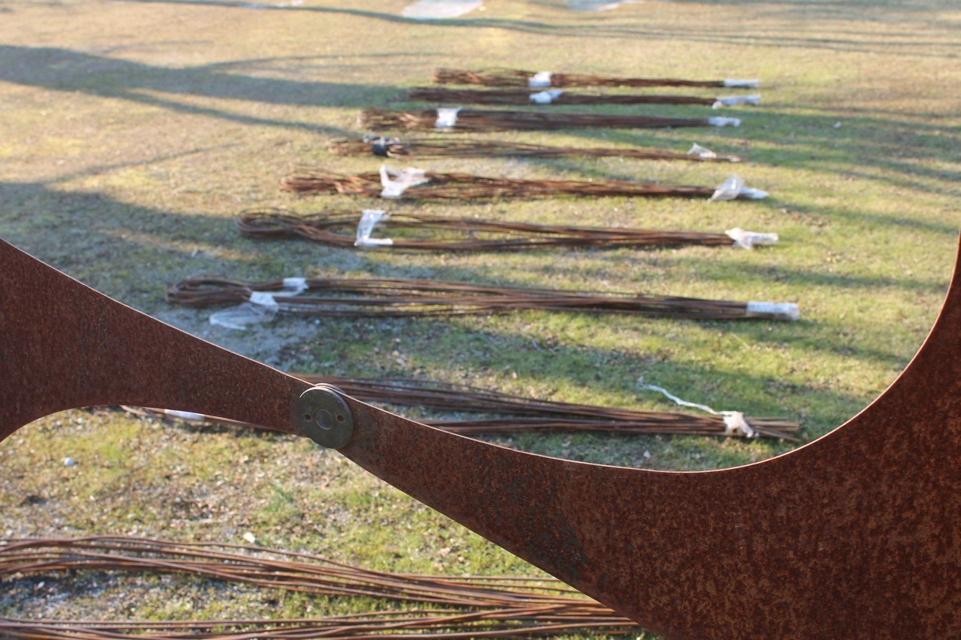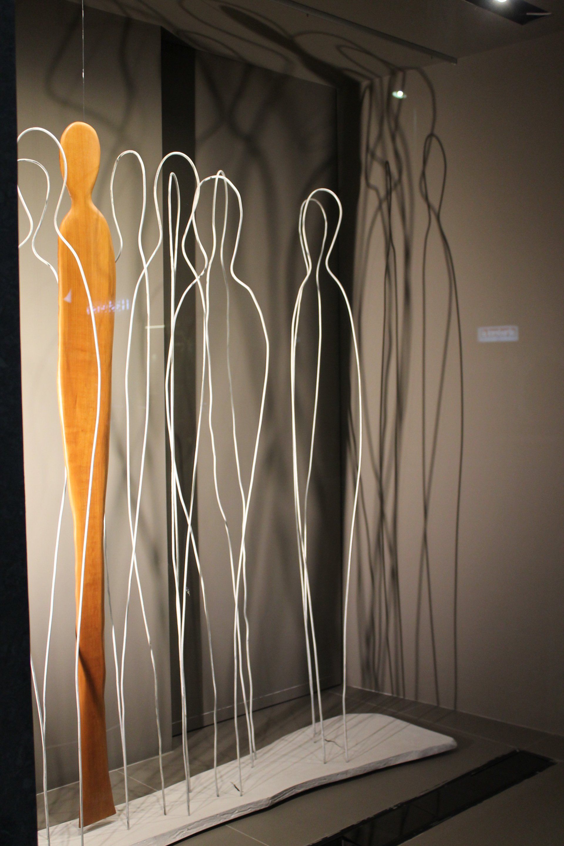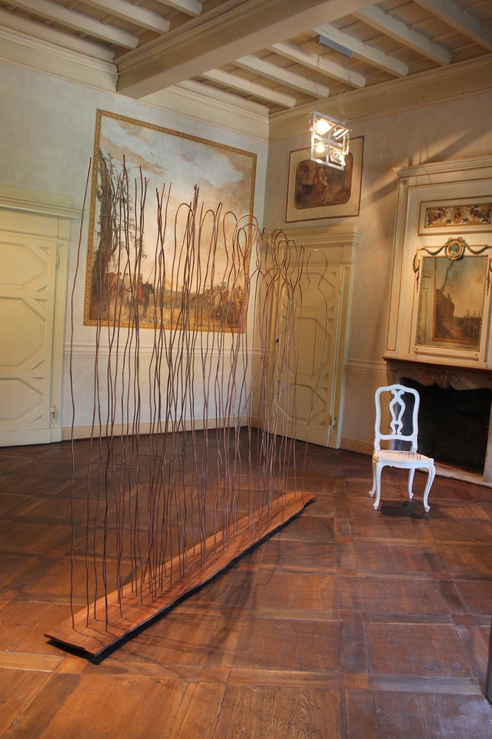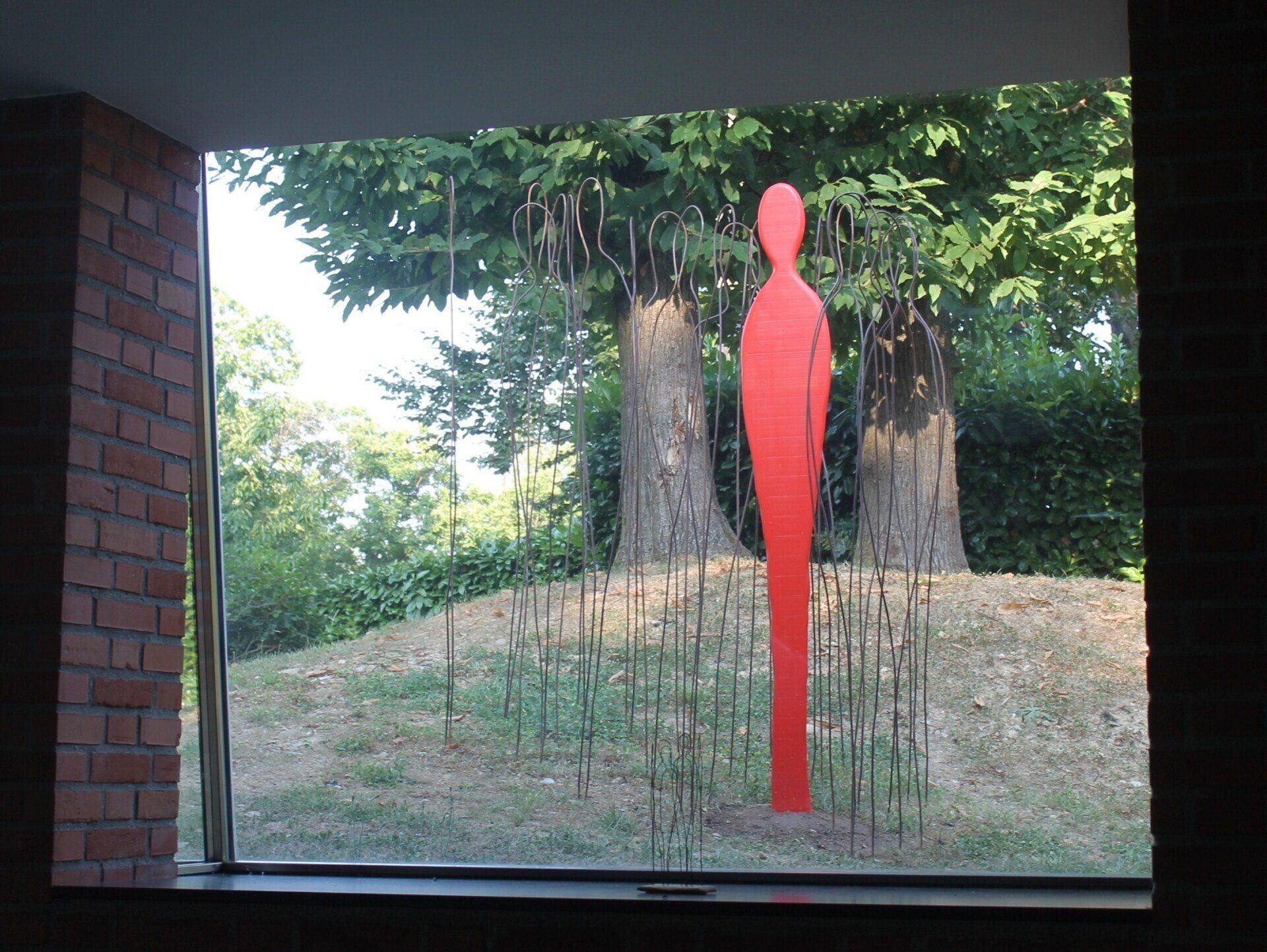 Seminare steli antropomorfi raccogliendo fiori di ferro. Una presenza di fili di ferro che non si defilano dalla vita, ma che si profilano eleganti ed essenziali nel paesaggio, istanze di rarefazione del segno: onde di ferro al calore bianco. Filiazioni di generazioni nell’età del ferro: un futuro arcaico che unisce mitologia titanica e pacata misura minimalista.